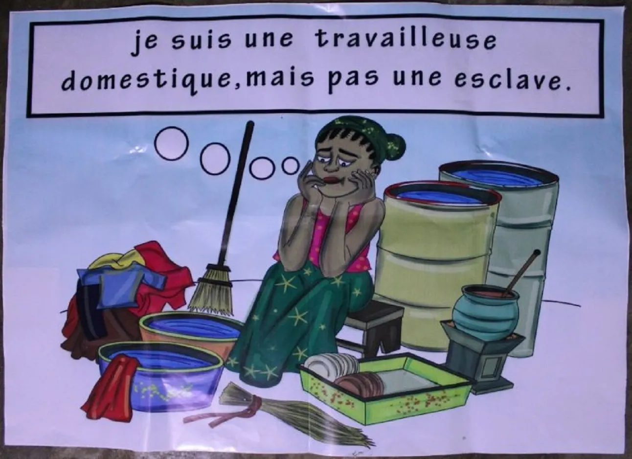 En réalité, rectifie-t-elle, « le/la travailleur/travailleuse domestique est un aide pour la femme qui travaille ailleurs dans un autre service et qui ne peut pas faire les travaux domestiques et a besoin d’un second bras. Ce second bras c’est pour l’aider dans des domaines précis » et non être obligé à faire à la fois « le ménage, entretenir les enfants et prendre soins de grand papa et grand maman », dénonce-t-elle.