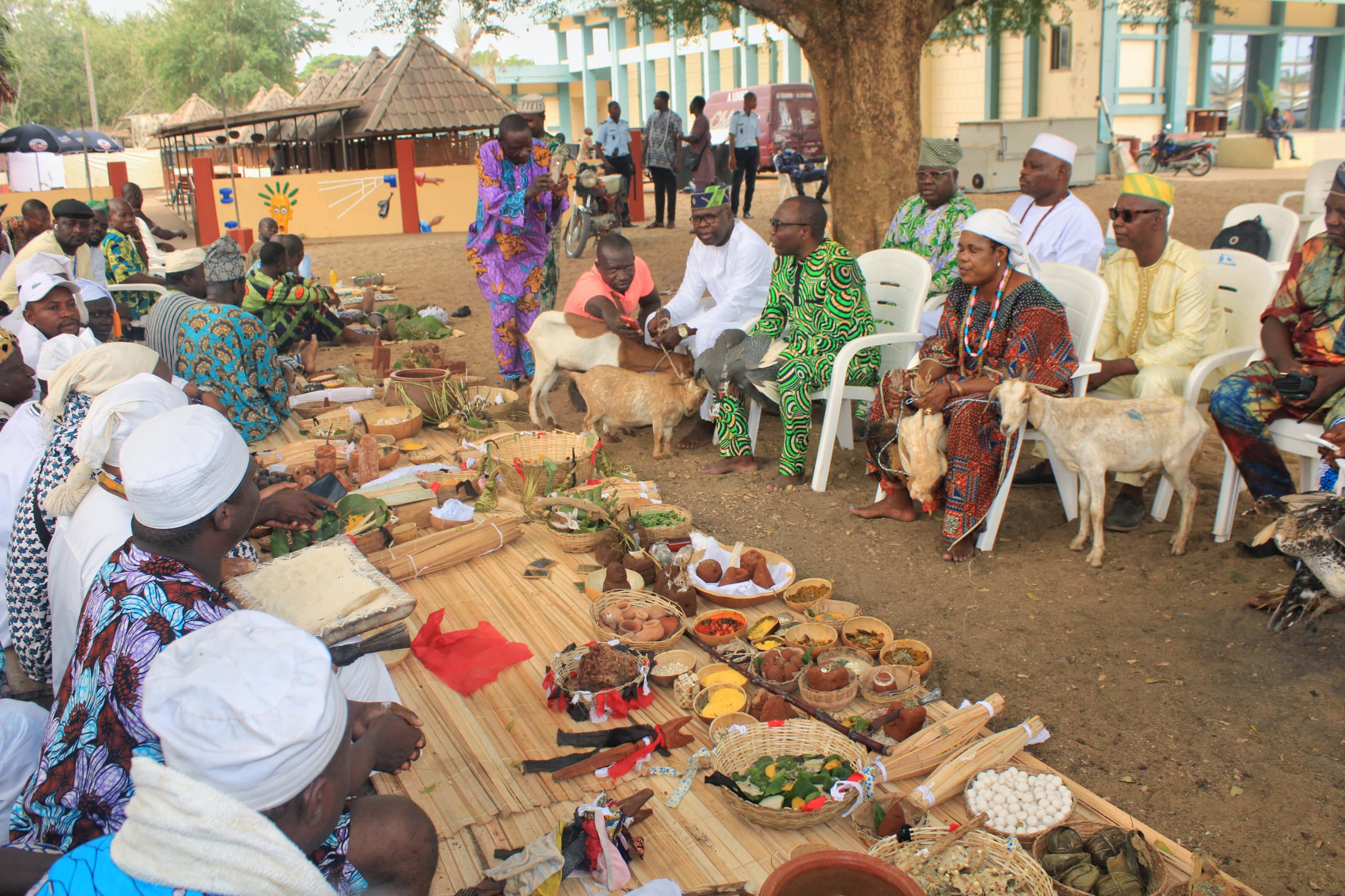 Les sacrifices se déroulent sous les yeux du Comité des rites Vodun. Son président, le professeur Mahougnon Kakpo supervise la cérémonie aux côtés d’autres membres dont le professeur Dodji Amouzouvi et Togbe Yedy.