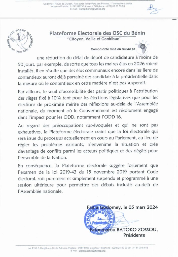 La Plateforme électorale des Osc suggère la suspension de l’examen du Code électoral en cours à l’Assemblée nationale. L’organisation parrainée par Wanep Bénin « craint que la loi électorale qui sera issue du processus actuellement en cours au Parlement, au lieu de régler les problèmes existants n’envenime la situation et crée davantage de conflits parmi les acteurs politiques et des dégâts pour l’ensemble de la Nation ».