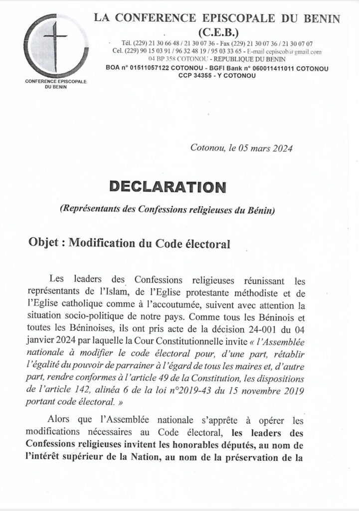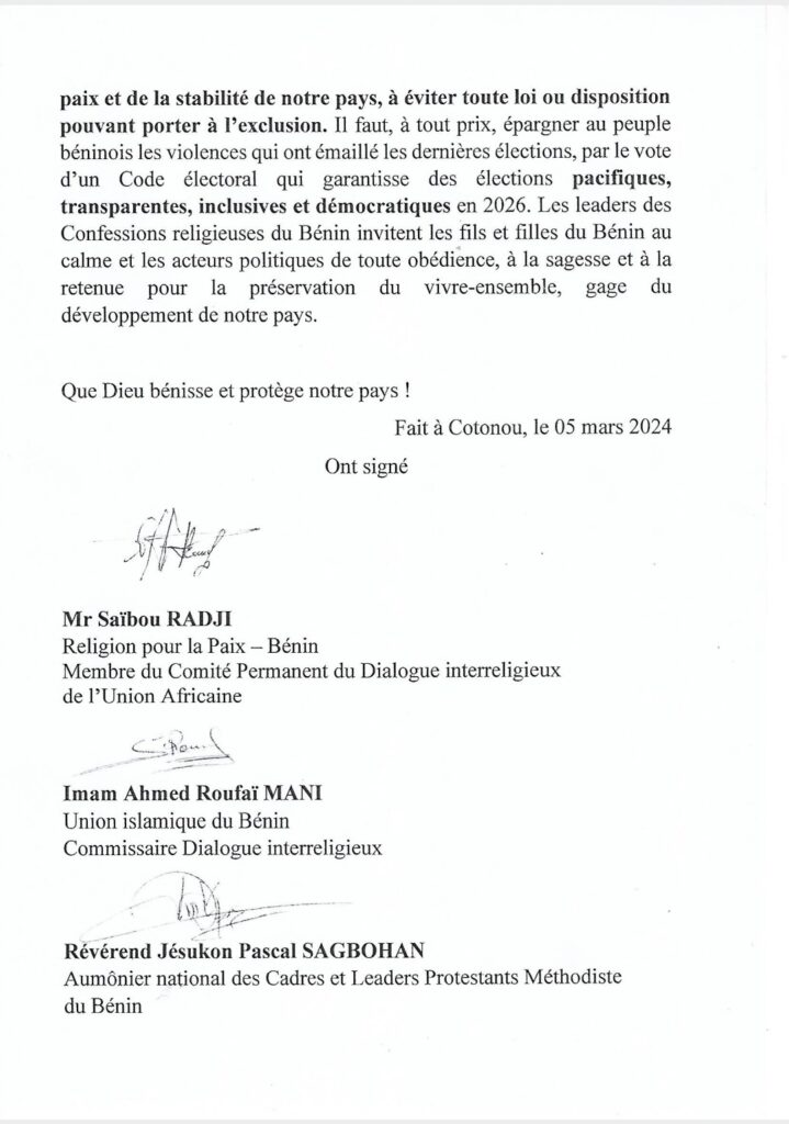 Alors que l’Assemblée nationale s’apprête à opérer les modifications nécessaires au Code électoral, les leaders des Confessions religieuses invitent les honorables députés, au nom de l’intérêt supérieur de la Nation, au nom de la préservation de la paix et de la stabilité de notre pays, à éviter toute loi ou disposition pouvant porter à l’exclusion. Il faut, à tout prix, épargner au peuple béninois les violences qui ont émaillé les dernières élections, par le vote d’un Code électoral qui garantisse des élections pacifiques, transparentes, inclusives et démocratiques en 2026. Les leaders des Confessions religieuses du Bénin invitent les fils et filles du Bénin au calme et les acteurs politiques de toute obédience, à la sagesse et à la retenue pour la préservation du vivre-ensemble, gage du développement de notre pays.