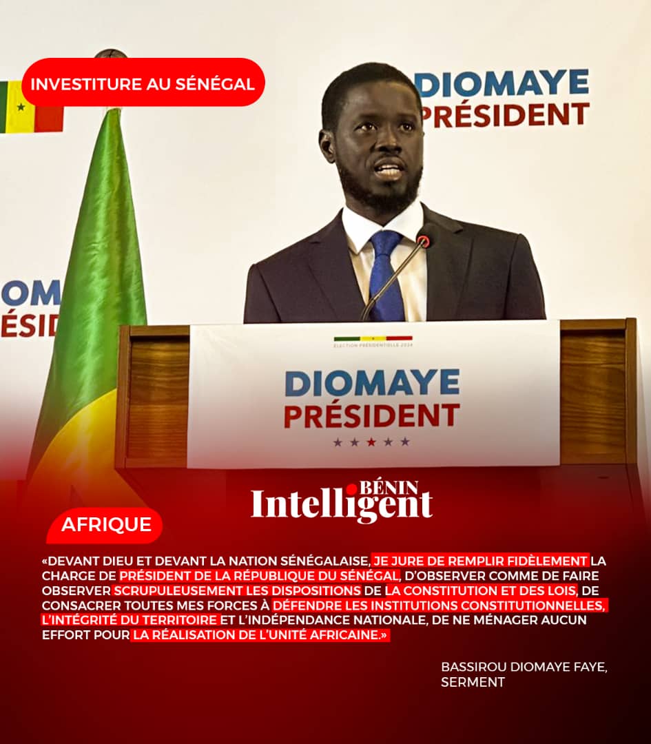 Tel est le serment prêté par le cinquième président de la République après Macky Sall, Abdoulaye Wade, Abdou Diouf et Léopold Sedar Senghor. Outre le corps diplomatique, une dizaine de chefs d’Etat ou de gouvernement africains assistent à l’investiture. Parmi eux, le nigérian Bola Tinubu, président en exercice de la Cedeao ; le vice-président ivoirien Thiémoko Koné; le Guinéen Général Doumouya, le Bissau-Guinéen Sissoko Uballo, le Gambien Adama Barrow et le mauritanien Mohammed Ould Ghazouani, président en exercice de l’Union africaine. Sans oublier le ghanéen Nana Akuffo Ado.