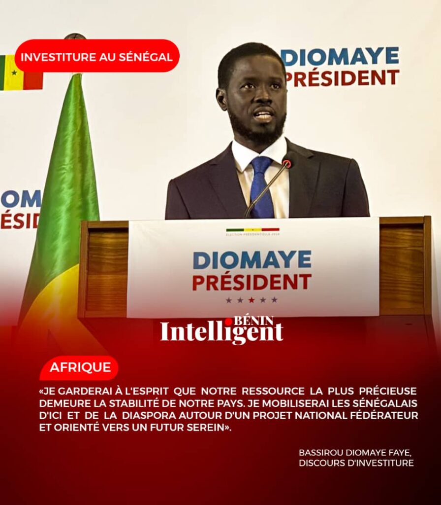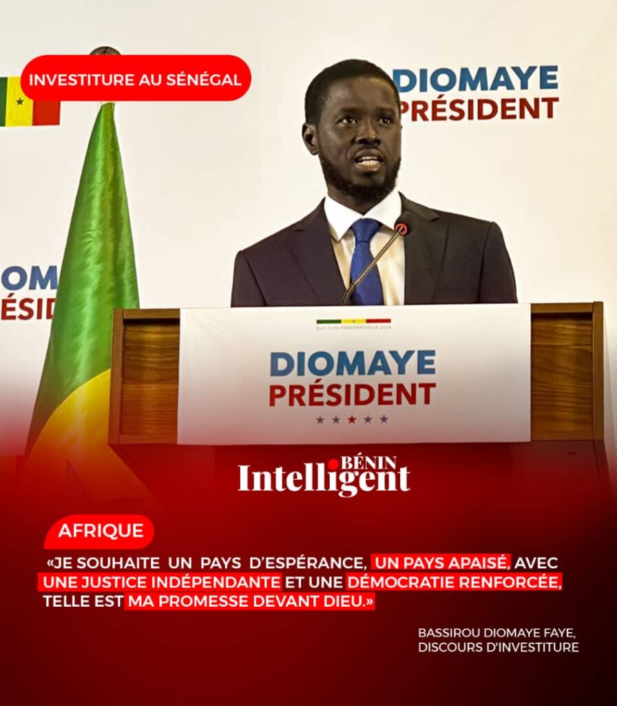 Bassirou Diomaye Faye souligne qu’ «Il est important que nous connaissions les succès et échecs de nos devanciers». «En définitive, c’est le Sénégal qui a gagné le 24 mars 2024. Les résultats [de l’élection présidentielle] expriment un profond désir de changement», a-t-il commenté. Au titre des engagements, «je travaillerai à la préservation de la paix et de la cohésion… Je m’engage à la promotion du culte du travail» et à «mettre le Sénégal dans la voie du progrès social et économique.» Au plan communautaire, Bassirou Diomaye Faye promet contribuer à «renforcer les efforts déployés pour la paix, la sécurité et l’intégration africaine».