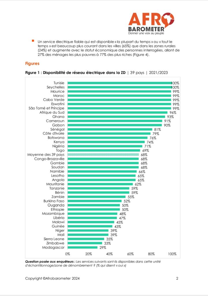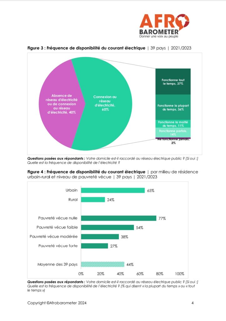 Aussi précise Afrobarometer, les ménages ruraux et pauvres sont particulièrement désavantagés, non seulement en termes d’accès et de connexion, mais également de qualité de service.