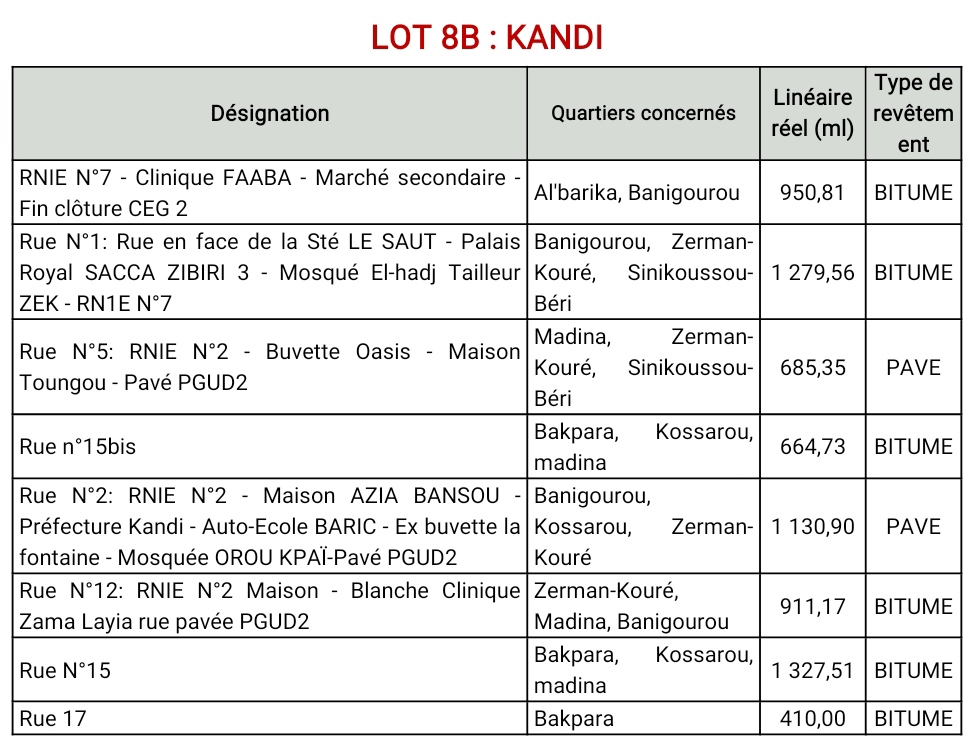 Dans la ville de Kandi, un investissement global de 19,39 milliards de francs Fcfa TTC est prévu. Ainsi, au titre de la phase B du projet Asphaltage, il est prévu la construction de 13.31 km de voirie urbaine. Aussi, 5.8 km de collecteurs d’eau pluviale seront réalisés. Le volet écologique sera marqué par la plantation de 2200 arbres d’alignement. Sans oublier 1120 lampadaires solaires