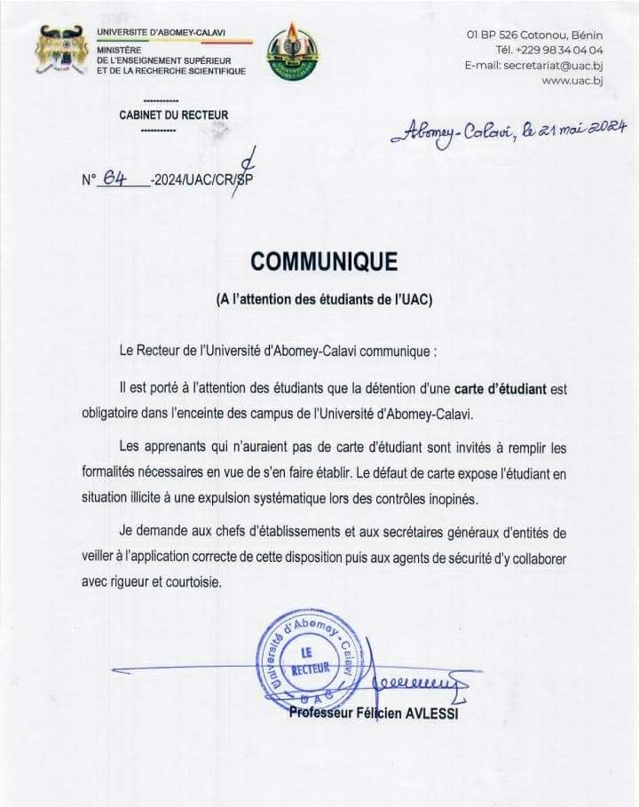 Il est porté à l’attention des étudiants que la détention d’une carte d’étudiant est obligatoire dans l’enceinte des campus de l’Université d’Abomey-Calavi.