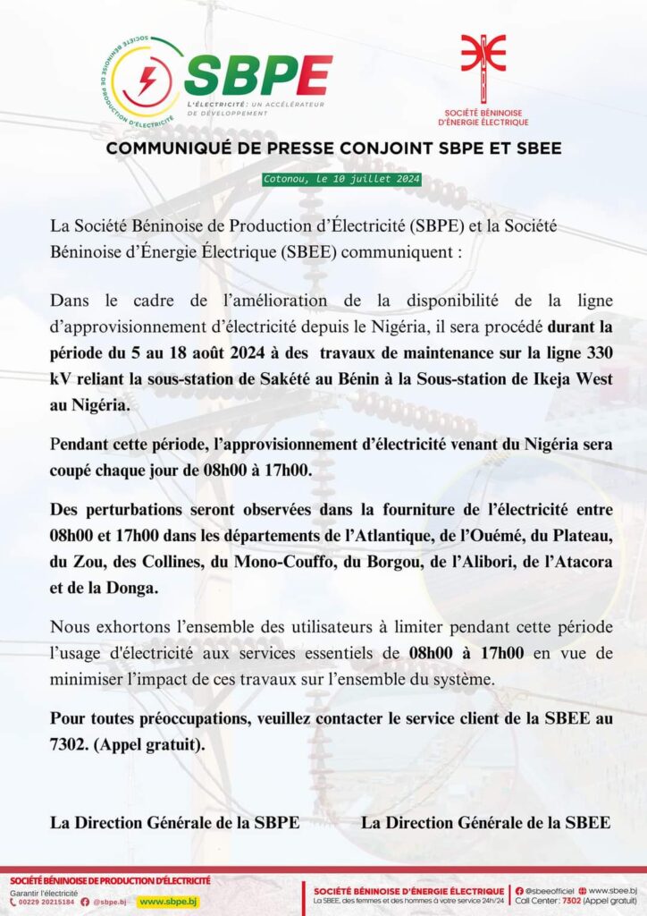 La Société béninoise de production d’électricité (Sbpe) et la Société Béninoise d’énergie électrique (Sbee) réalisent en août prochain de grands travaux de maintenance. Ces travaux seront effectués la ligne 330 kV reliant la sous-station de Sakété au Bénin à la Sous-station de Ikeja West au Nigéria.