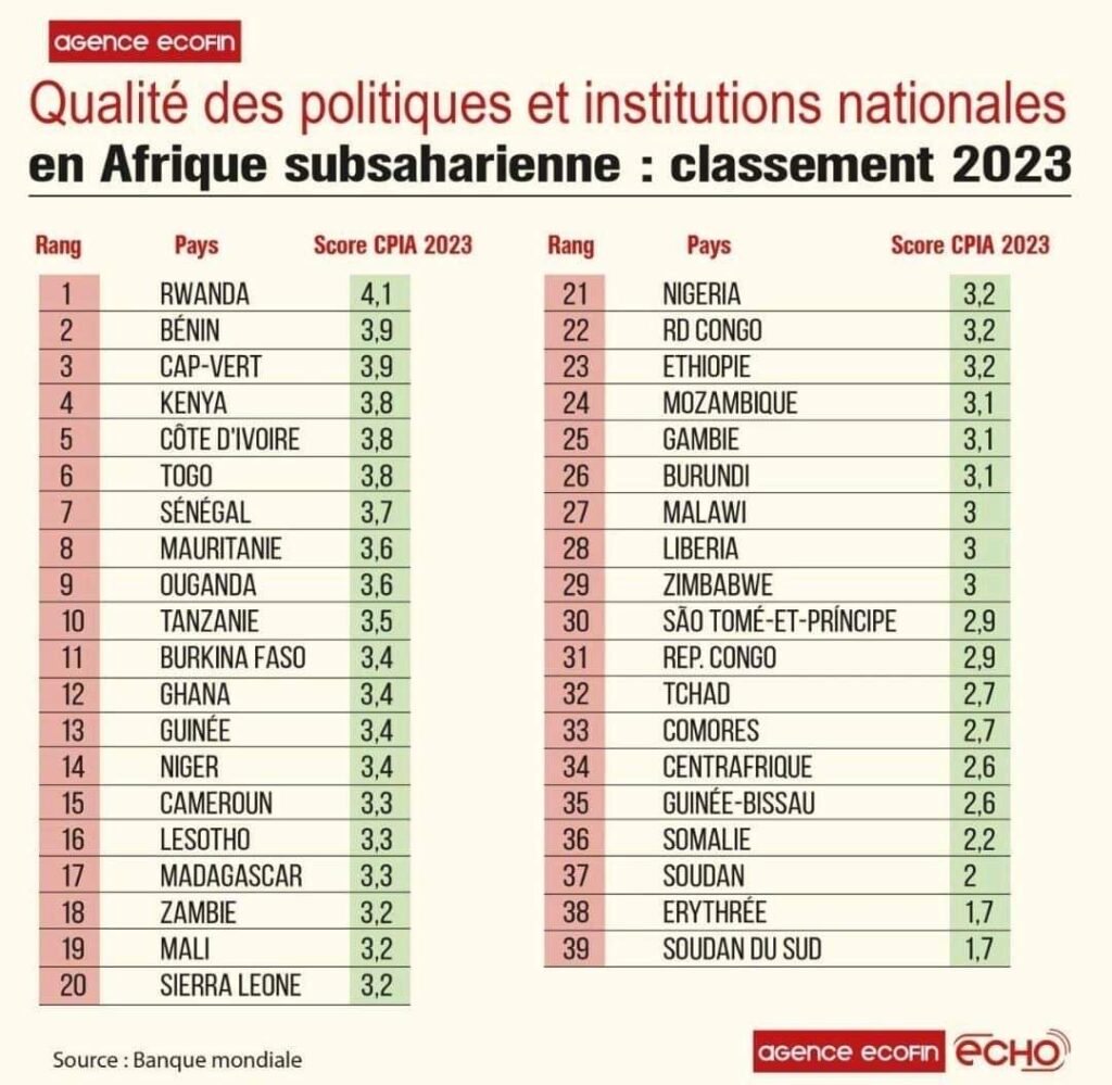 La qualité des politiques et institutions nationales du Bénin reconnue par la Banque mondiale. En 2023, l’institution financière classe le pays 2e en Afrique subsaharienne avec un score de 3,9. Puis, 1er en Afrique de l’ouest. Le Rwanda vient en tête de ce classement avec un score de 4,1.