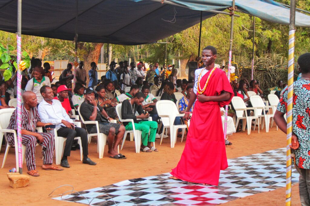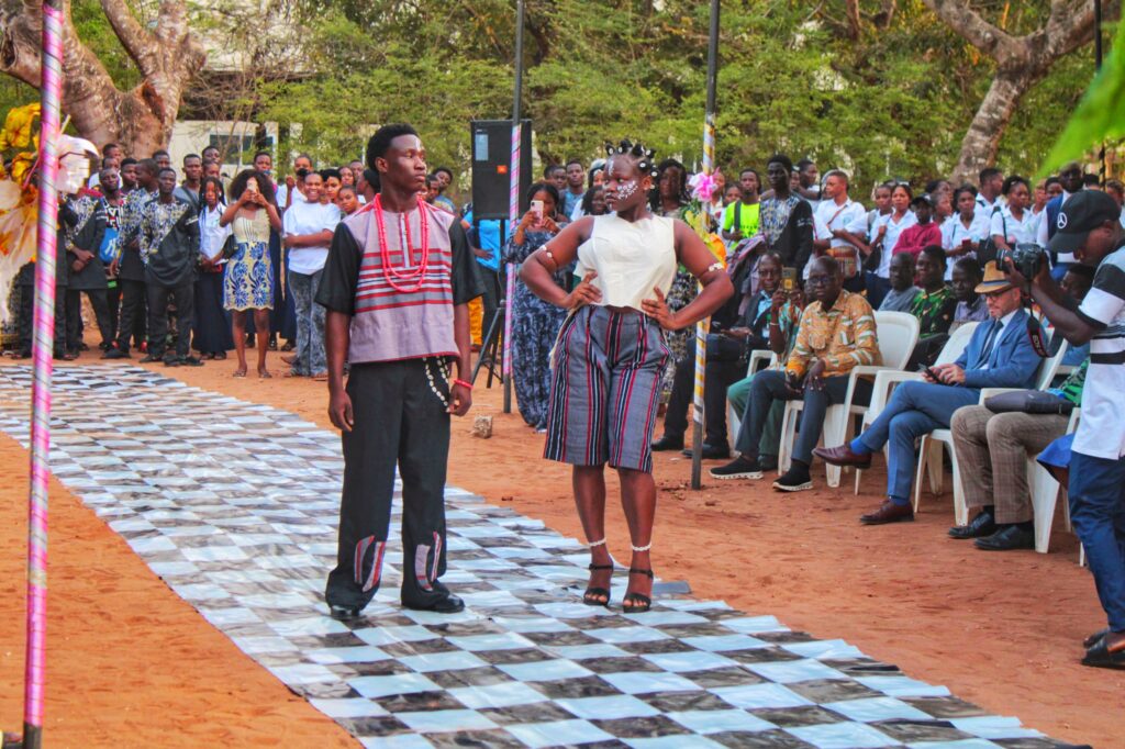 Sur un tapis en damier blanc noir, installé au milieu de deux grandes bâches face à face, 13 étudiants ont joué les mannequins pour sublimer 26 créations imaginées et créées par des étudiants en Arts plastiques. Le défilé intitulé ”Entre traditions et modernité” est organisé par les étudiants en 3e année de licence en Administration culturelle. À l’encadrement, Modeste Tchibozo et Dr Blandine Agbaka, Cheffe du Département des arts visuels et du Patrimoine.