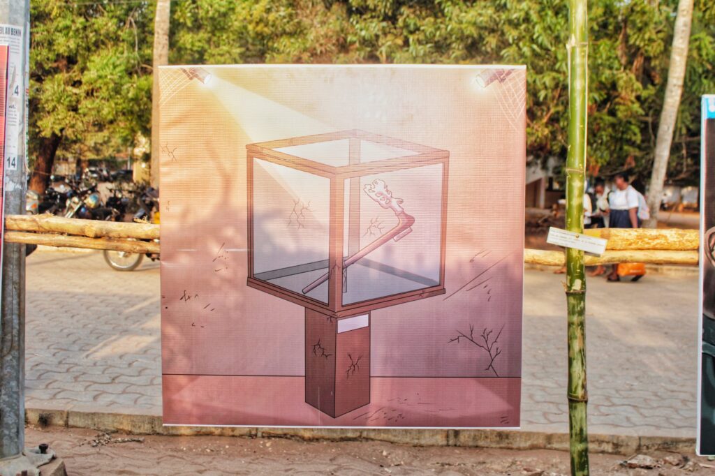 L’œuvre “Vision divergente” d’Ahouansou Schélomith est éloquente à ce propos. Elle propose une composition percutante : deux yeux disproportionnés, l’un en larmes, l’autre marqué du sigle “Fcfa”. Puis un pied géant, en guise de nez, écrasant des poteries sous la pression d’un caterpillar jaune.