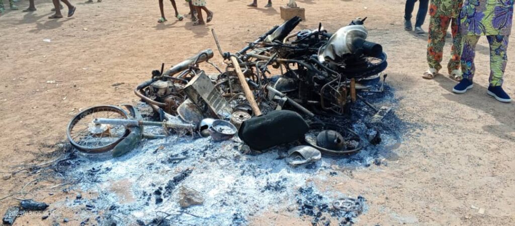 Suite à ces événements, les représailles ne se sont pas fait attendre. Dans la nuit du 4 mars, les proches de feu Saturnin passent à l’attaque. « Ce groupe armé envahit la famille Olakere. Soumise à une forte pression et ne voulant répondre à la provocation les membres de la famille abandonnèrent leurs domiciles. Les assaillants ont détruit toutes les maisons, incendiés tous les biens appartenant à la famille Olakere, plus de vingt ménages ont été complètement détruits et saccagés, les documents, les habits, les pièces d’état civil, passeport, diplômes, moyens roulant, argents en espèces ; des vivres ; des sacs de soja ; d’acajou entièrement consumés, un enclos de bêtes brûlé avec tous les animaux. Ces actes de vandalismes ont été commis pendant trois jours (4,5 et 6) mars 2025 » décrit le collectif.