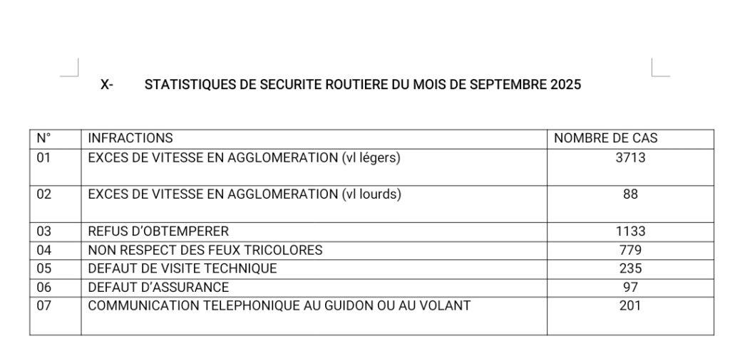 Les chiffres obtenus de la Police républicaine par le quotidien Bénin Intelligent, pour le mois de septembre 2025, viennent rappeler une triste réalité : l’excès de vitesse en agglomération reste l’infraction reine, loin devant le refus d’obtempérer ou le non-respect des feux. Une situation qui alerte sur les comportements à risque en milieu urbain.