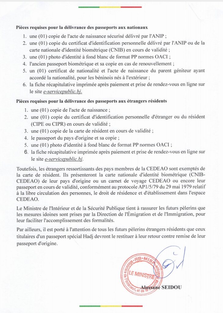Le ministre de l’Intérieur et de la sécurité publique lance l’opération spéciale de délivrance des passeports biométriques pour le pèlerinage à la Mecque 2026. Dès le 1er décembre, les candidats des départements de l’Atlantique, Littoral, Ouémé, Plateau, Mono et Couffo pourront retirer leurs documents à la Direction de l’émigration et de l’immigration à Cotonou.
